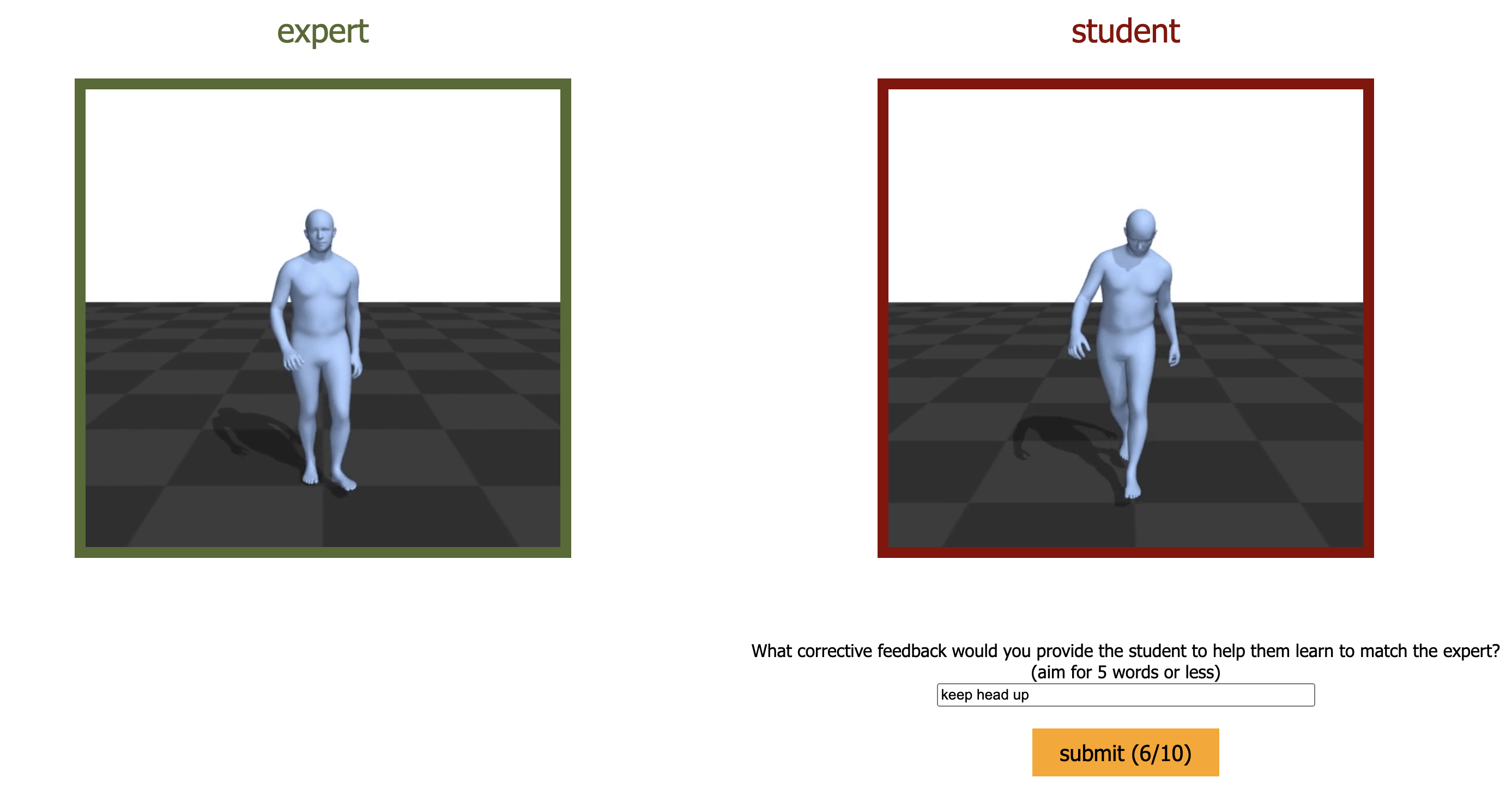 1. You will be asked to provide 10 corrections, each corresponding to one of 10 paired demonstrations of Expert/Student human models performing a specific, but unknown, motion (e.g. walking or jumping).