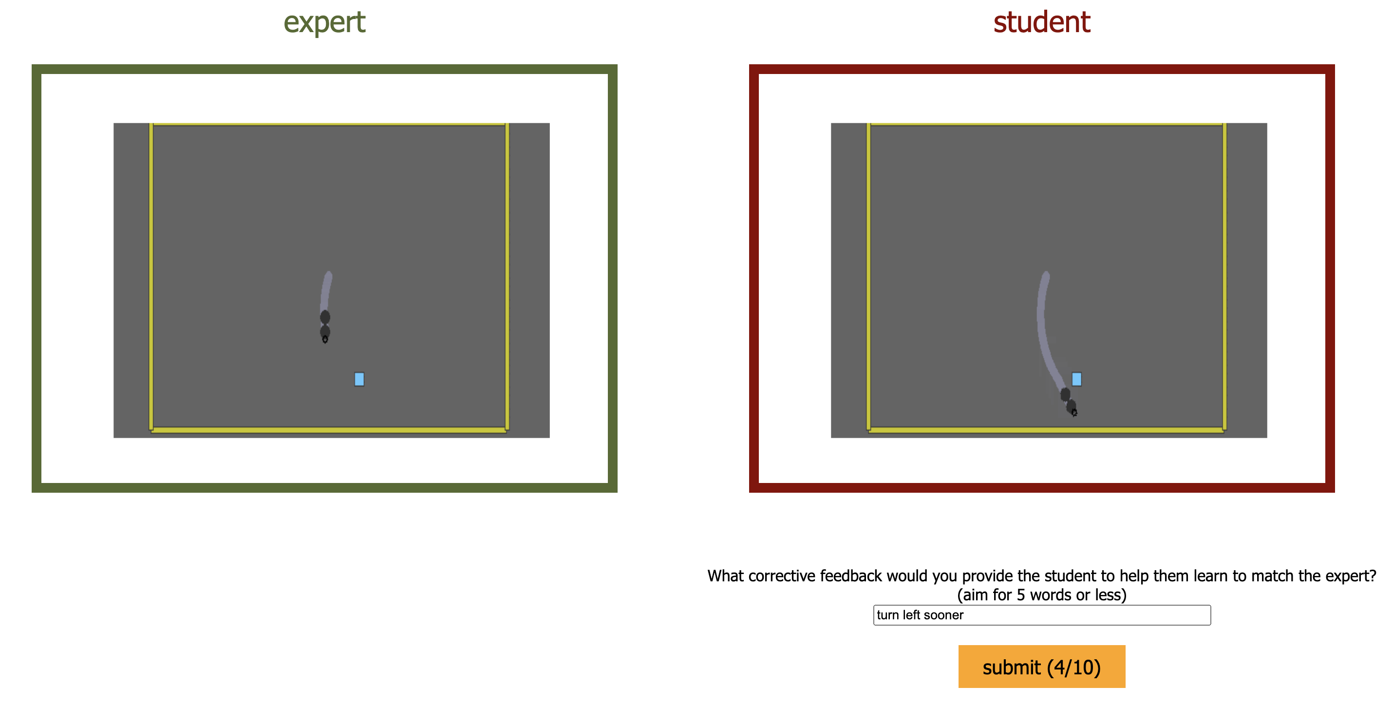 1. You will be asked to provide 10 corrections, each corresponding to one of 10 paired demonstrations of Expert/Student attempts to park a vehicle at a goal spot (marked by a BLUE square).