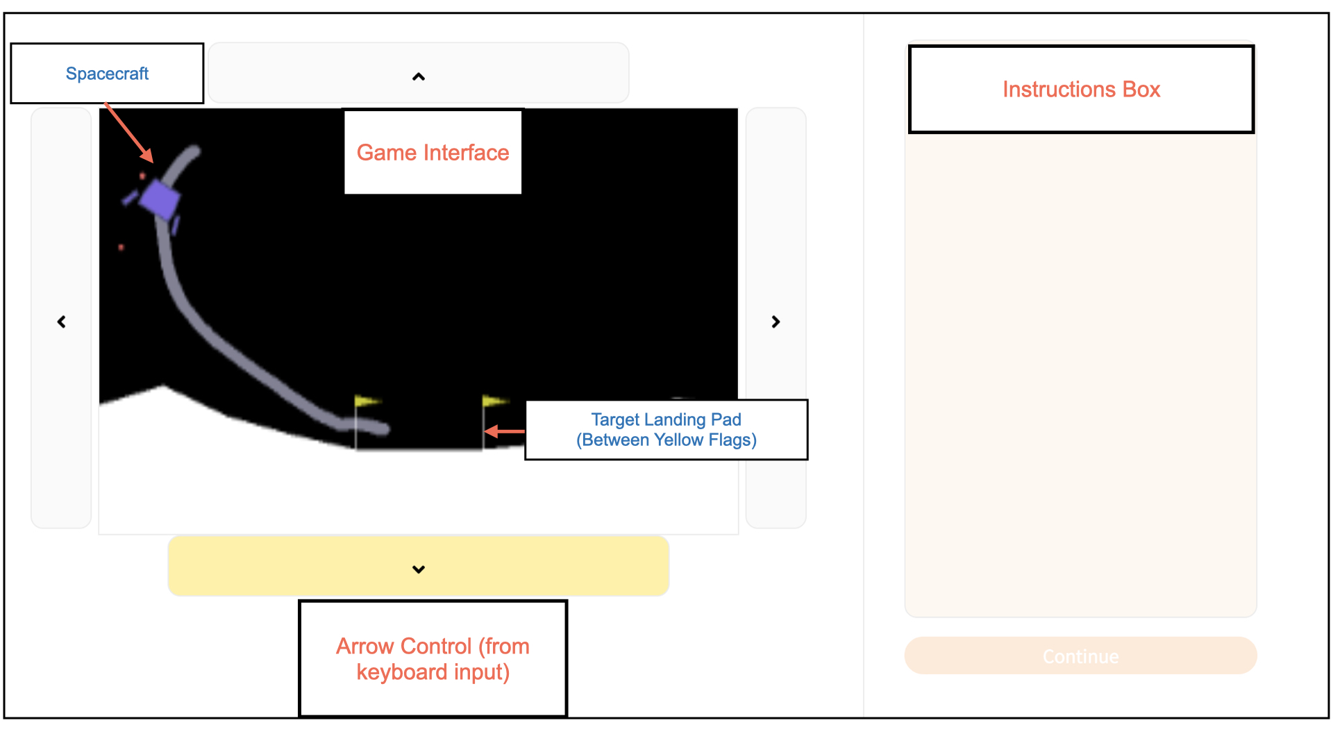 The goal of the game is to land the spacecraft in the landing pad (between the two yellow flags). The spacecraft will fire its engine opposite to the direction of the arrow key you pressed. To control the spacecraft, you can use the four arrow keys on your keyboard: up, down, left, and right. When a key is pressed, the corresponding arrow in the game interface will be highlighted (see image above). For example, pressing the left arrow causes the spacecraft's right engine to fire (shown by red dots), providing a force to the left.